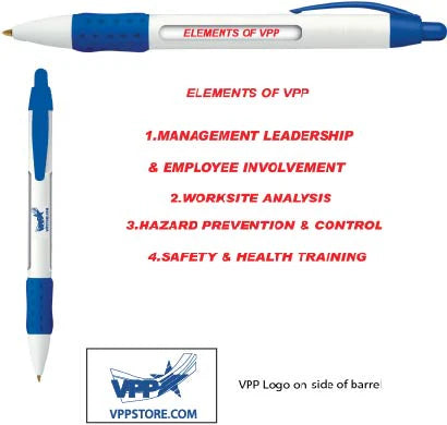 • Pen comes with the 4 Elements of VPP in red along with the OSHA VPP logo (2V) in blue on the pen barrel.