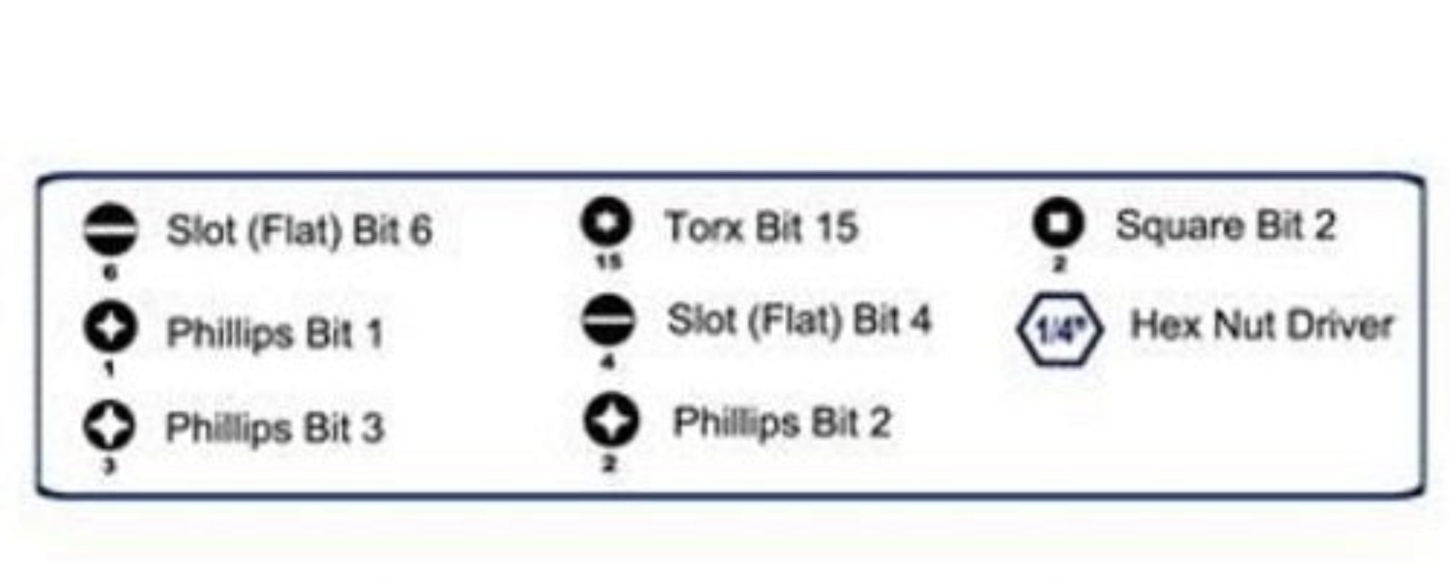 • Includes Slot (flat) bit 6, Slot (flat) bit 4, Phillips bit 1, Phillips bit 2, Phillips bit 3, Torx bit 15, Square bit 2, and a Hex Nut Driver at the end of the shaft.