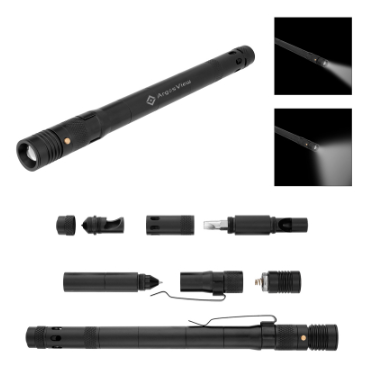 • Includes Telescopic LED Flashlight, Ballpoint Pen, Pen Clip, Whistle, Phillips Head Screwdriver, Bottle Opener and Window Breaker