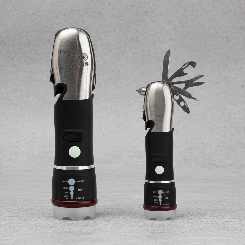 • Includes: COB Flashlight, Seat Belt Cutter, Window Breaker, Flat Head
